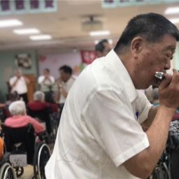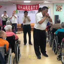 彰化社大口琴社指導老師張家盛與社員跟長者們結緣相見歡,以口琴吹奏充滿陽光氛圍〈陪我看日出〉暖場;〈望春風〉、〈綠島小夜曲〉、〈雨夜花〉等多首膾炙人口台灣歌謠,勾起長者們年輕的回憶,有的隨著優美旋律哼唱、有的舞動雙手。曲末,師生群一一祝福長者們,法喜充滿幸福快樂每一天。