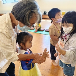 律動唱遊時間,孩子們隨著〈幸福的臉〉音樂舞動,體會幸福與快樂。接著進行「找領袖」團康遊戲,以手勢與肢體動作玩剪刀石頭布,促進彼此互動,培養團隊合作與專注力。