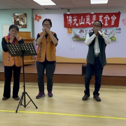 彰化社大「空靈鼓班」張美玲師生演奏〈紫竹調〉,「口琴社」李照民師生吹奏〈綠島之夜〉等曲,義工們引導長者隨著旋律揮舞雙手,陶醉在樂音中,享受優美的旋律。張美玲表示,空靈鼓源於中國古代西周樂器編鐘,音聲澄清、空靈而悠遠,期能引領聽者靜心安住,把煩惱拋諸九霄雲外。李照民分享,欣喜與學員演奏妙美音聲供養大眾,盡一份公民的責任,歡喜與眾結緣。