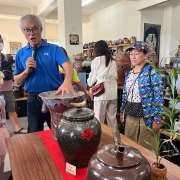 彰化聯合創作陶坊創始人李淳雄,為大家導覽手作陶藝品。在陶坊大門入口處擺放著許多柴燒貓頭鷹,顧盼自若表情各異。陶坊陳列上釉柴燒創意花器、茶葉罐、茶壺、水方、茶碗、時尚(石上)動物、創意時鐘、人生百態臉譜等,琳琅滿目豐富多元。