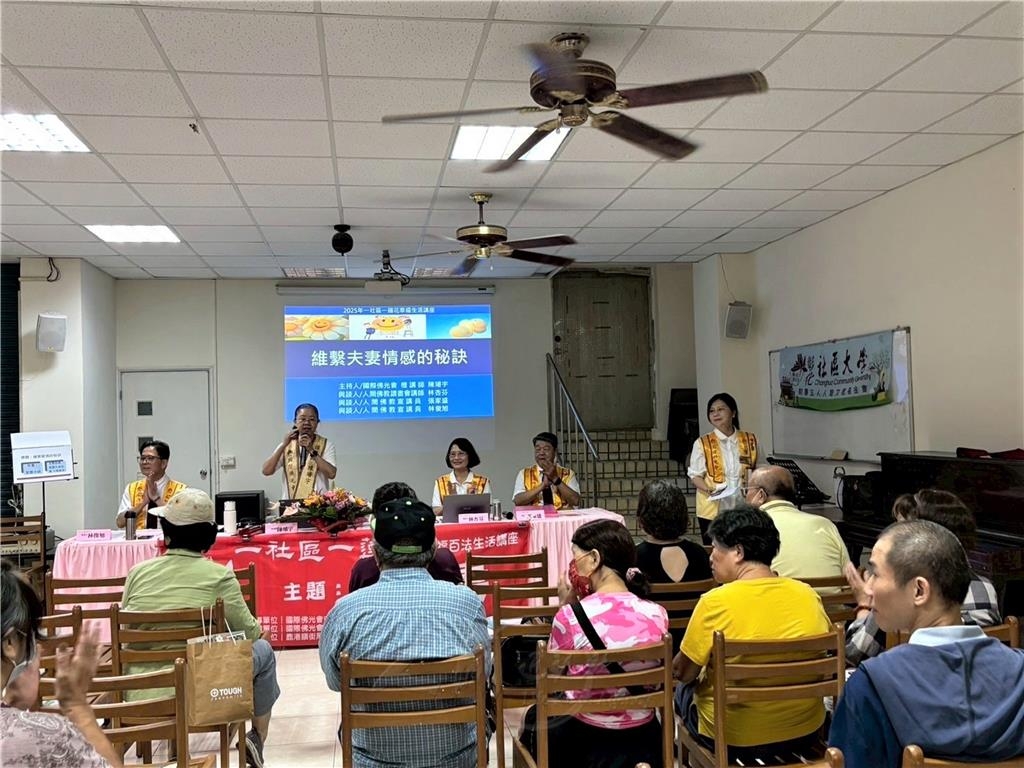 彰化社區大學6月18日晚上於鹿港中山御花園舉辦幸福生活講座,主題「維繫夫妻情感的秘訣」,邀請彰化社區大學季生命教育講師陳璿宇主持,彰化社區大學社團-快樂讀書趣的社員林杏芬、張家盛及林俊旭與談分享。鹿港鎮街尾里里長許勝嘉、中山御花園管理委員會主任委員蔡水及社區里民70人聆聽。