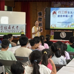 彰化社區大學5月16日在彰化縣花壇鄉文祥國小舉辦校園講座,主題「行三好生活、創造幸福人生」,邀請彰化社區大學講師暨教育部生命教育講師陳璿宇主講,講座透過生活小故事及感人的影片闡述「行三好」的核心價值。講師以提問方式與國小三至四年級84位師生討論如何運用生活做好事、說好話、存好心,活出自己幸福的人生。
