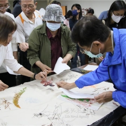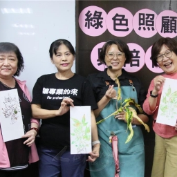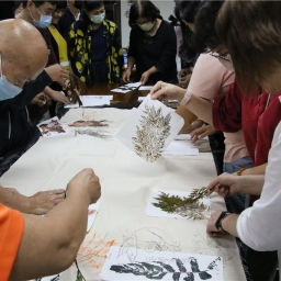 劉娪瑈帶領學員進行植物拓印體驗並指出,綠色照顧運用的媒介「植物」就是一種生命,透過「融入、體驗、共鳴、分享」的歷程,從挑選喜愛的綠色植物中重新自我建立獨處關係;再由2人分組的協同合作,選塗顏料拓印植物互動中創造認識友伴的機會;最後透過團體互助共同完成獨特的版畫作品,從中感受接受幫助和協助他人,是自然又溫暖療癒的幸福時光。