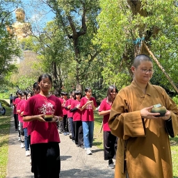活動中,有禮法師帶領師生體驗「茶香禪韻–與大地同行」的經行。學生手持九分滿的茶缽,沿著「蝶舞步道」走向樟樹林區,學習專注於每一步,守護心念與自然。知德法師提醒大家:「守護地球、愛護植物,才能擁有美好的生活環境。」並以「三好卡」與師生結緣,鼓勵大家「做好事、說好話、存好心」。