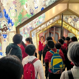 佛館導覽員吳昱伶帶領師生參觀「華彩萬象–石窟藝術沉浸體驗」、「東方微笑 跨越千年–麥積山石窟藝術特展」,觀賞《貧女一燈》4D影片。學生們驚歎於科技重現古代壁畫與造像的壯麗,感受到絲綢之路文化交流的繁榮,及文化遺產在現代的生命力。影片中,貧女阿照的孝心與願力,感得「眾燈皆熄,唯有一燈猶存。」深深觸動了孩子的心。