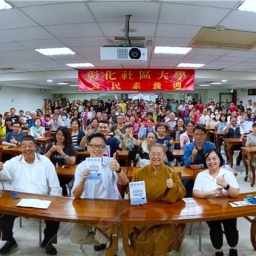 彰化社區大學4月29日舉行公民素養周–專題講座,邀請中正大學心理學系兼任助理教授蔡宇哲博士主講「好好休息」,主任如輝法師帶領170位師生全程聆聽樂活好眠的秘訣:「作息規律、睡前放鬆。」社大口琴社團張家盛、劉娪瑈師生演奏〈月夜愁〉揭開序幕。